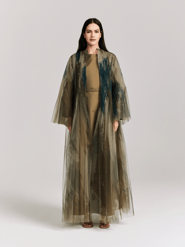 OLIVE GATHERED PRINTED TULLE ABAYA WITH TAFFETA INNER