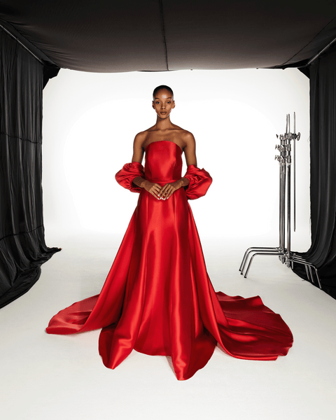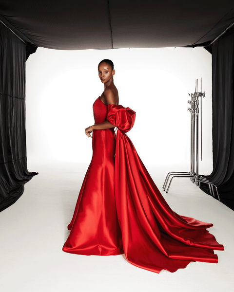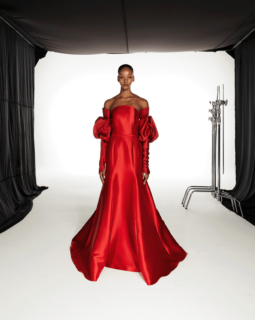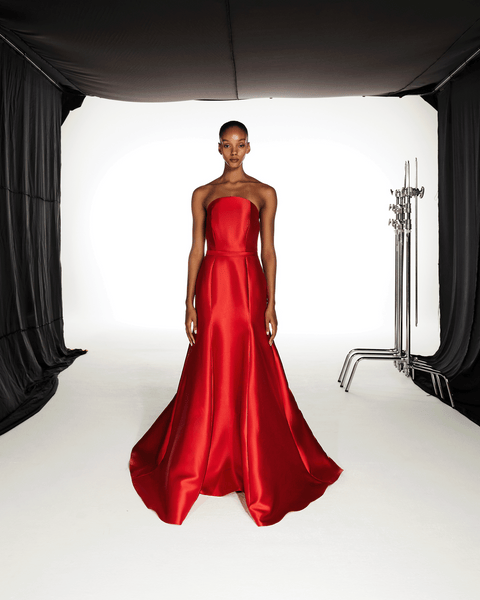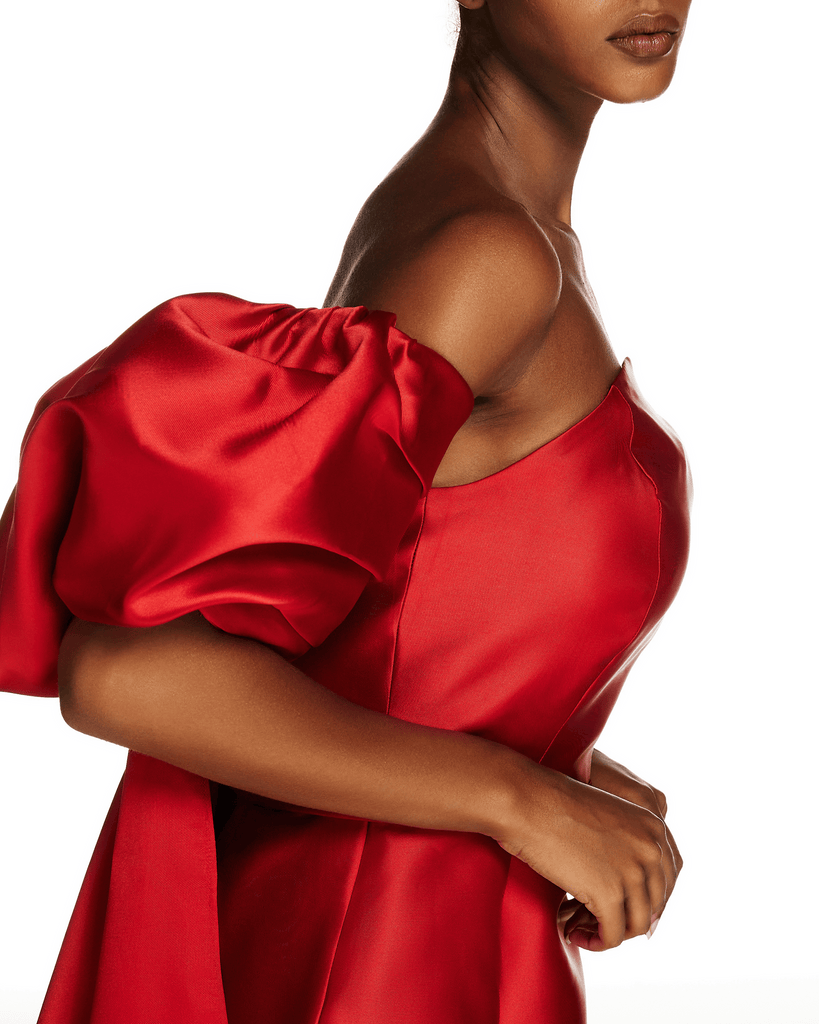RED TUBE SATIN MULTIPANEL DRESS WITH A CAPE