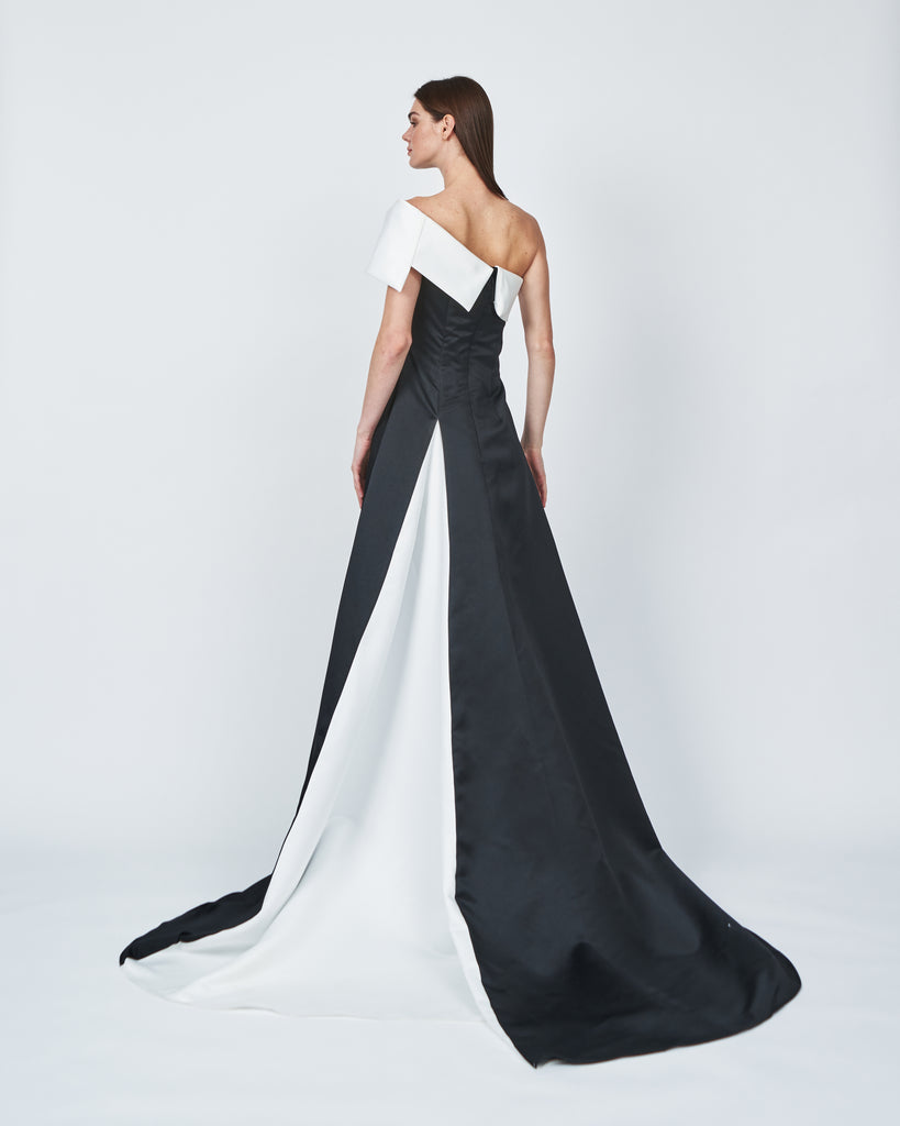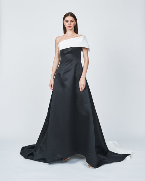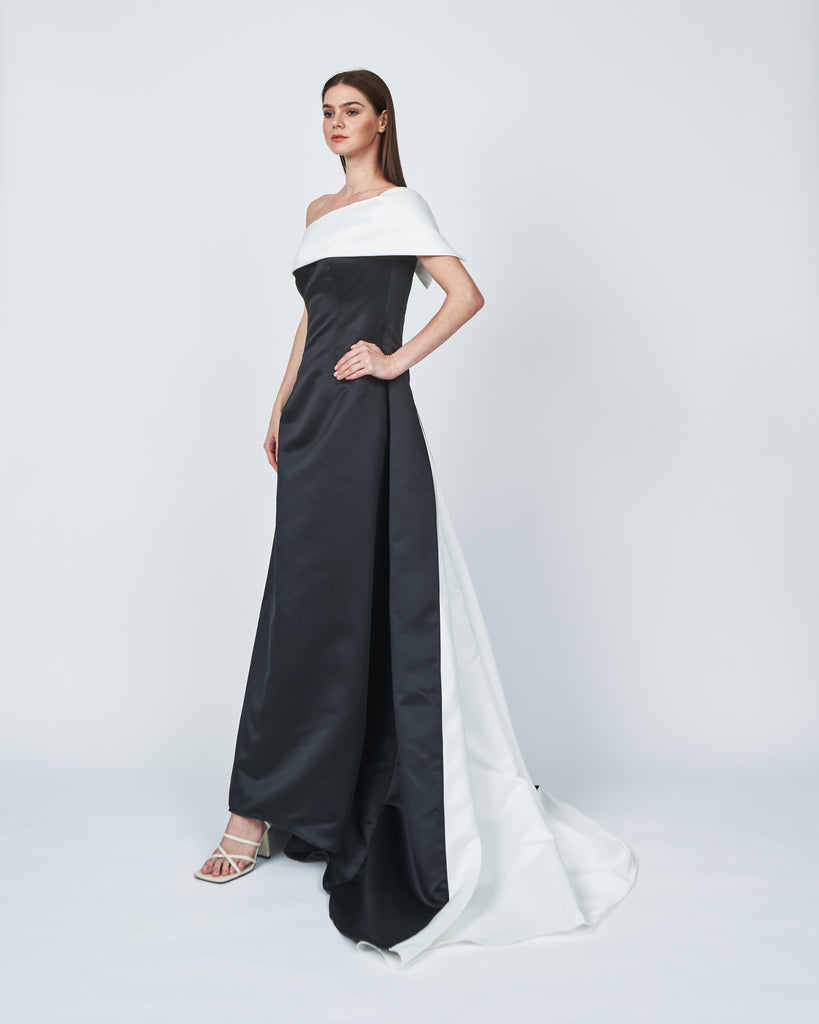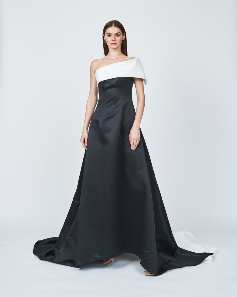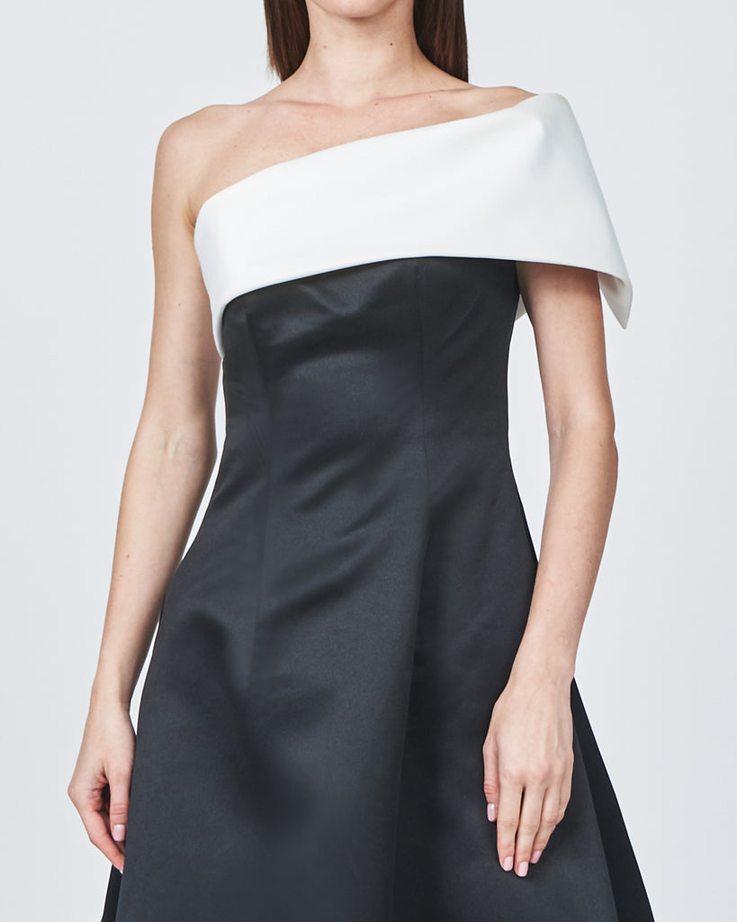 SATIN ONE SHOULDER FLARED DRESS