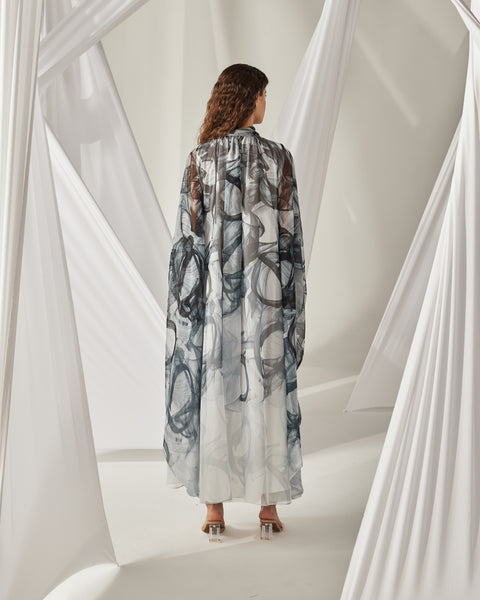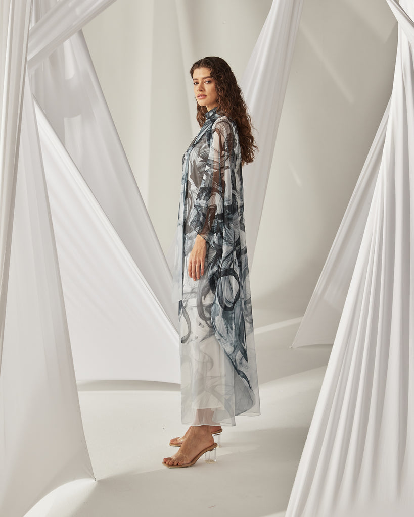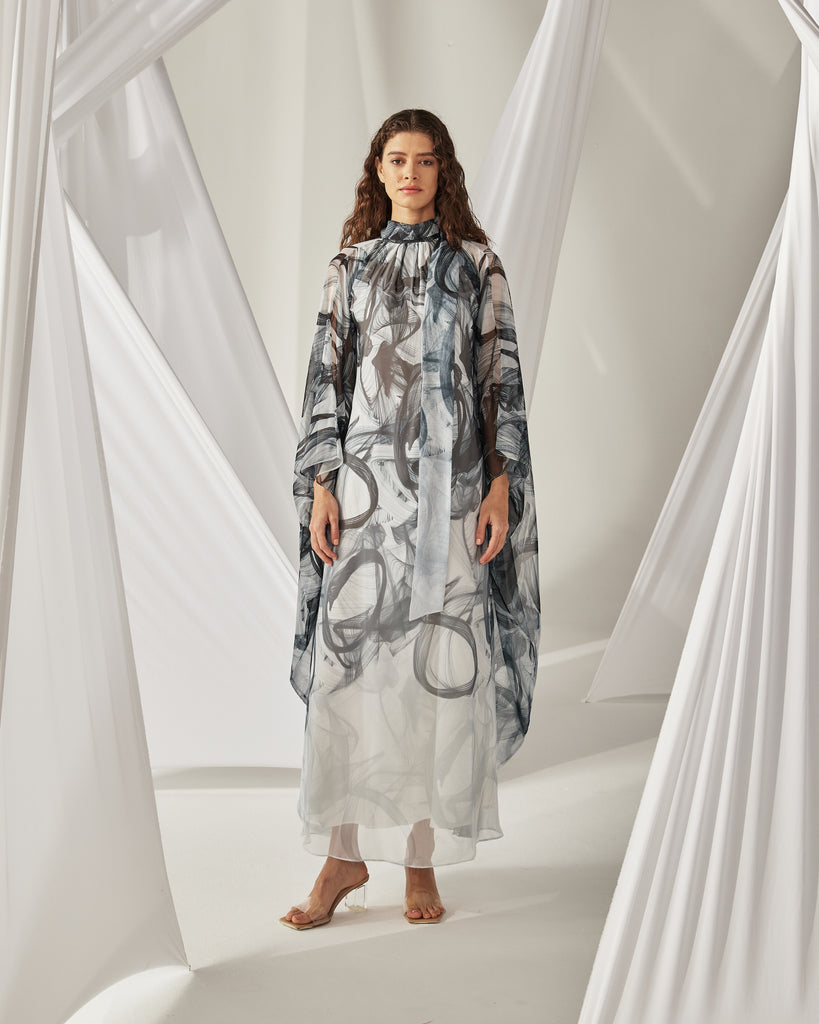 BLACK AND WHITE INK PRINTED CHIFFON OVERSIZED DRESS