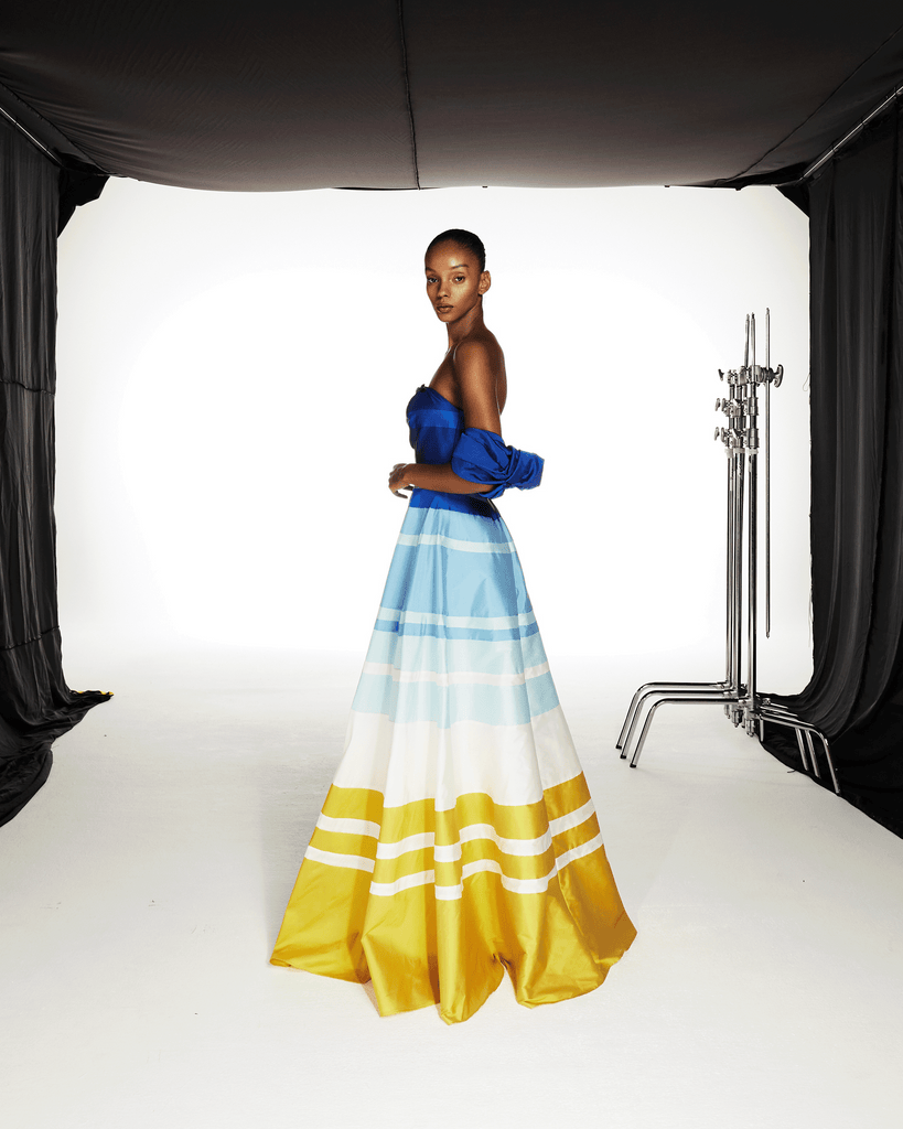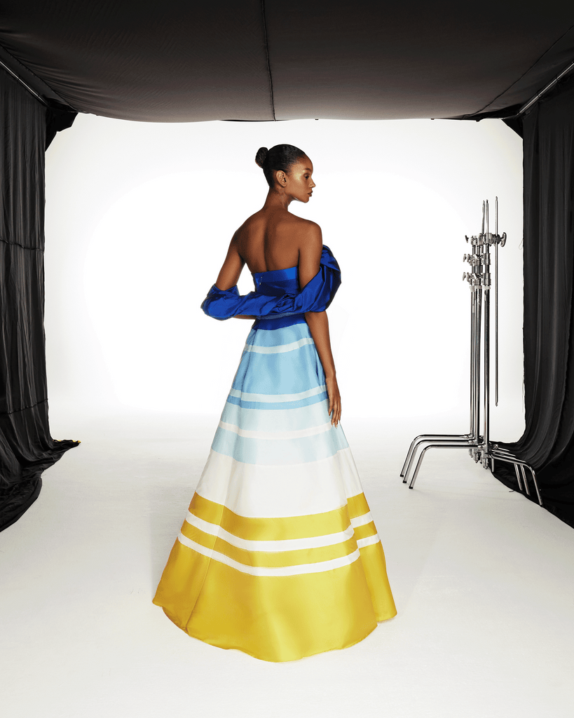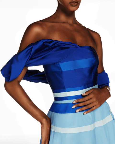 MULTI PANEL TAFFETA FLARED TUBE DRESS
