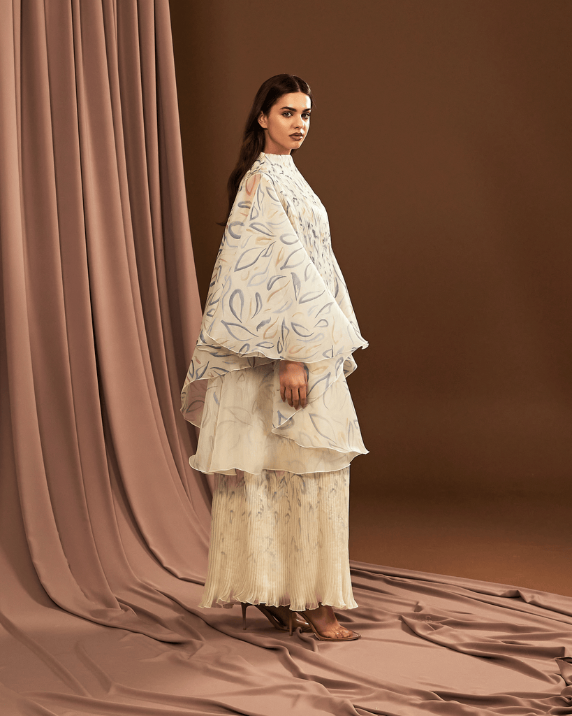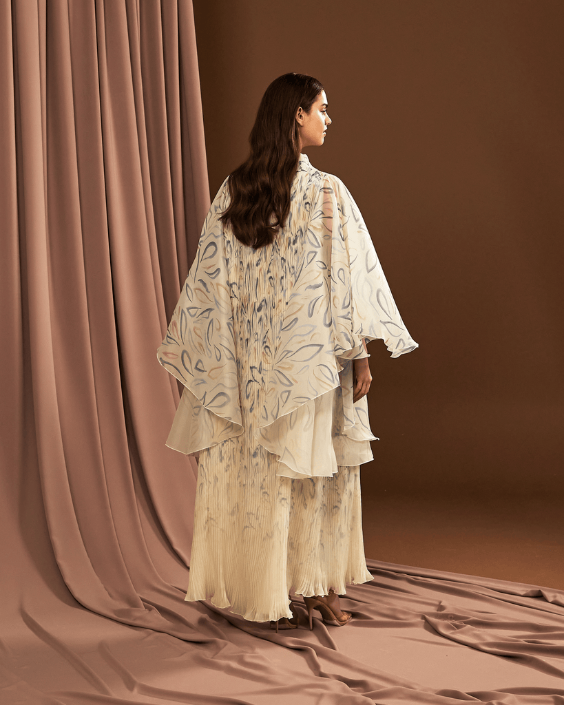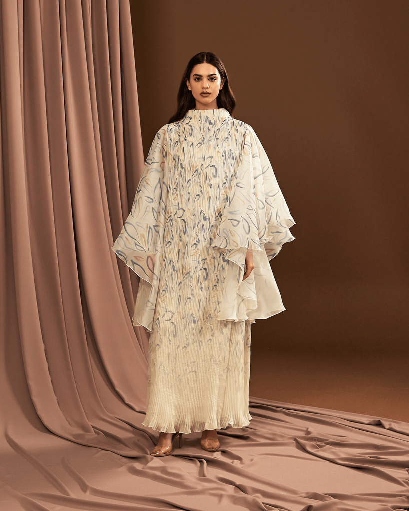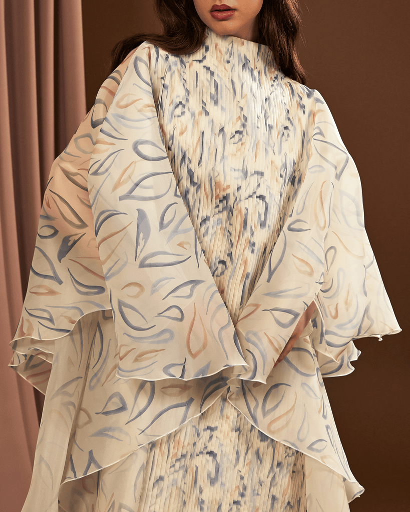 OFF WHITE PRINTED AND PLEATED ORGANZA DRESS WITH FLARED SLEEVES