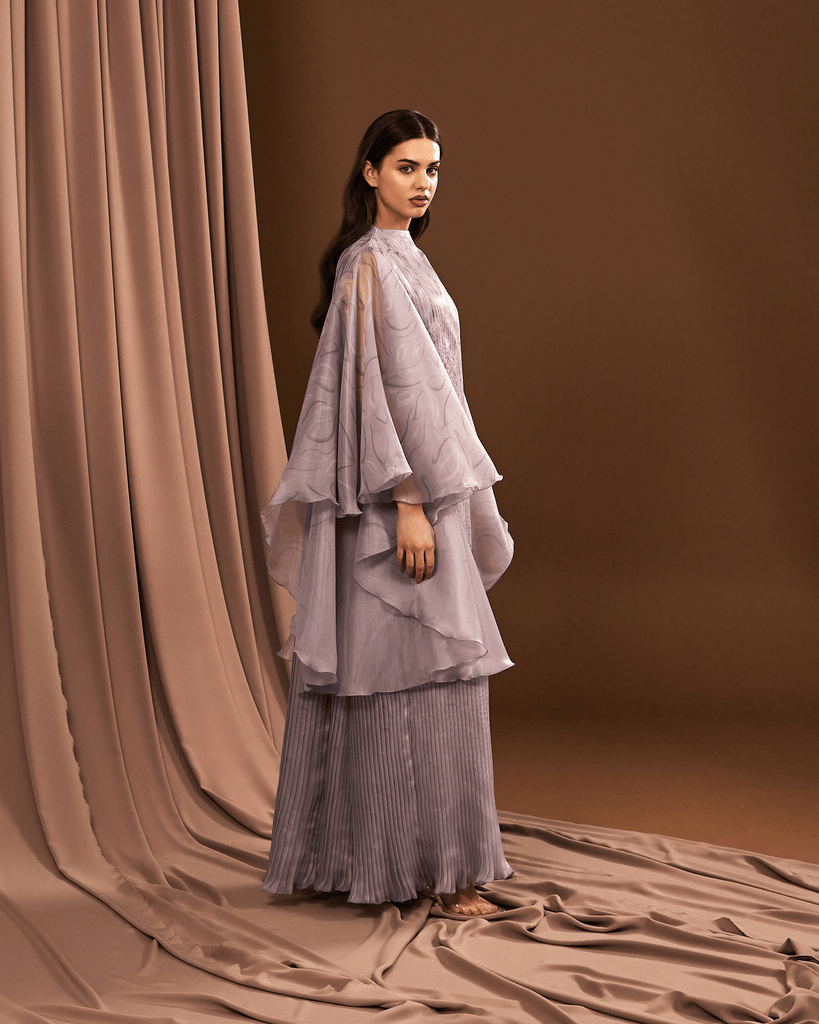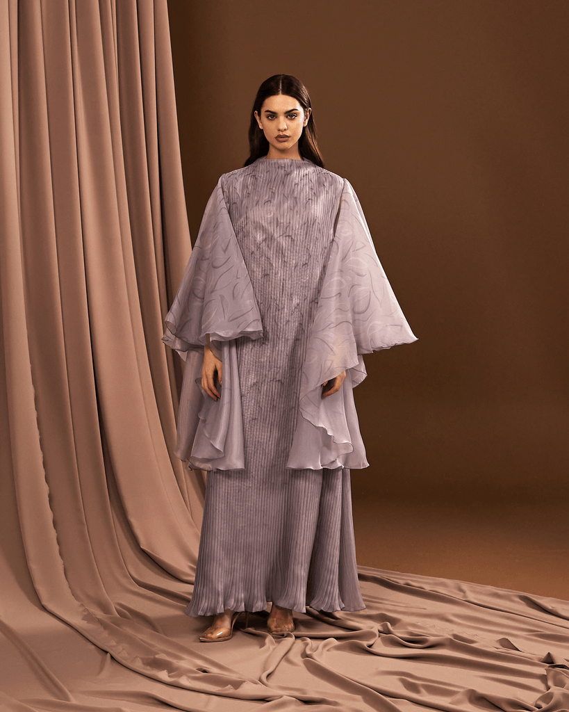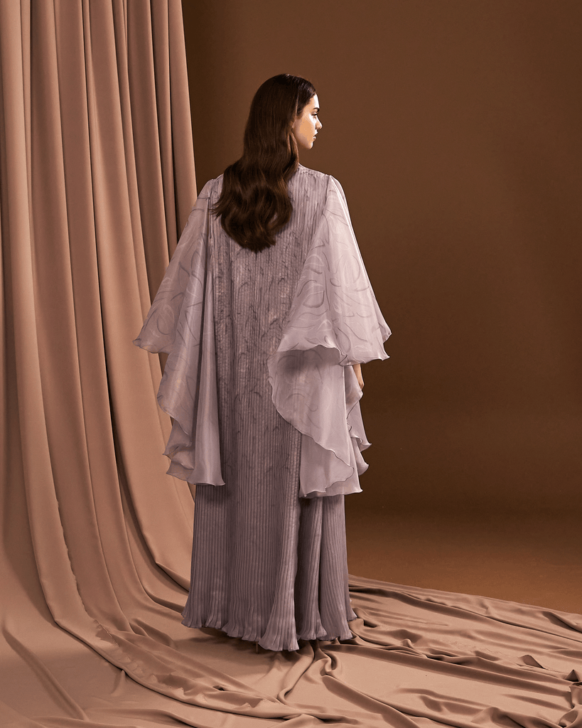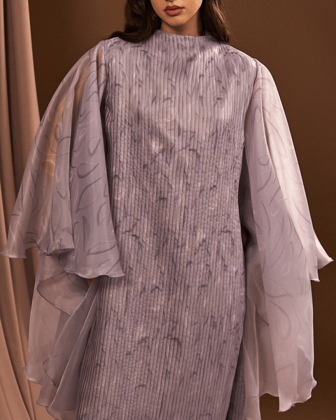 PURPLE PRINTED AND PLEATED ORGANZA DRESS WITH FLARED SLEEVES