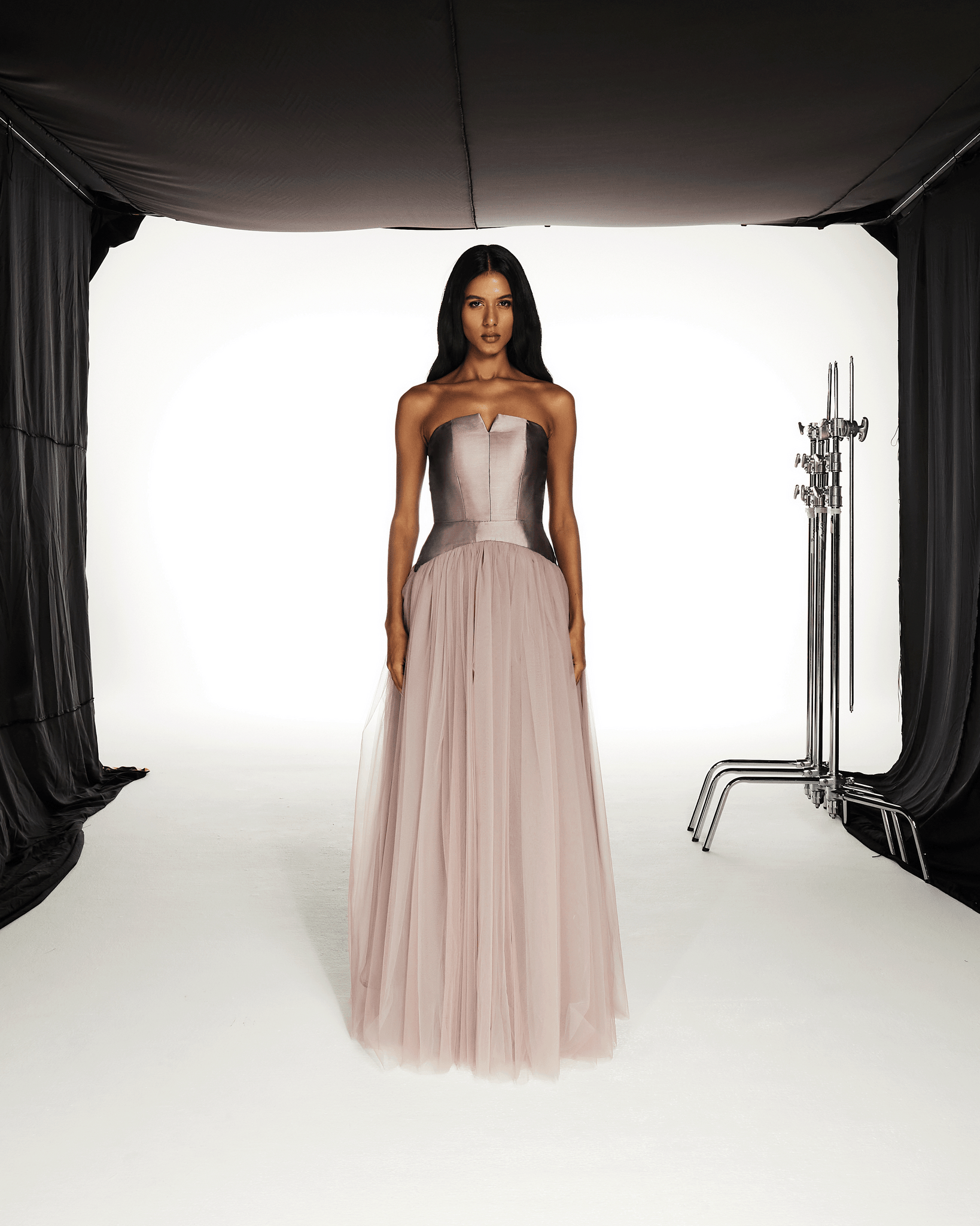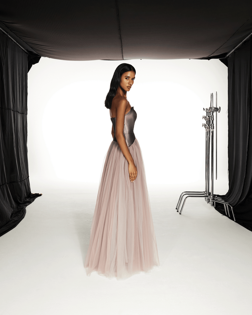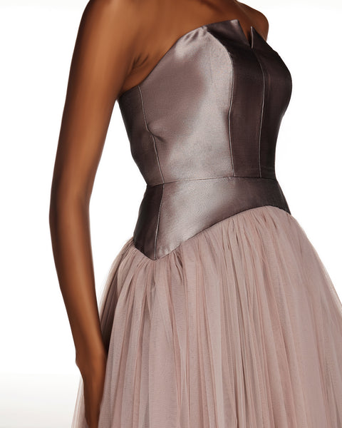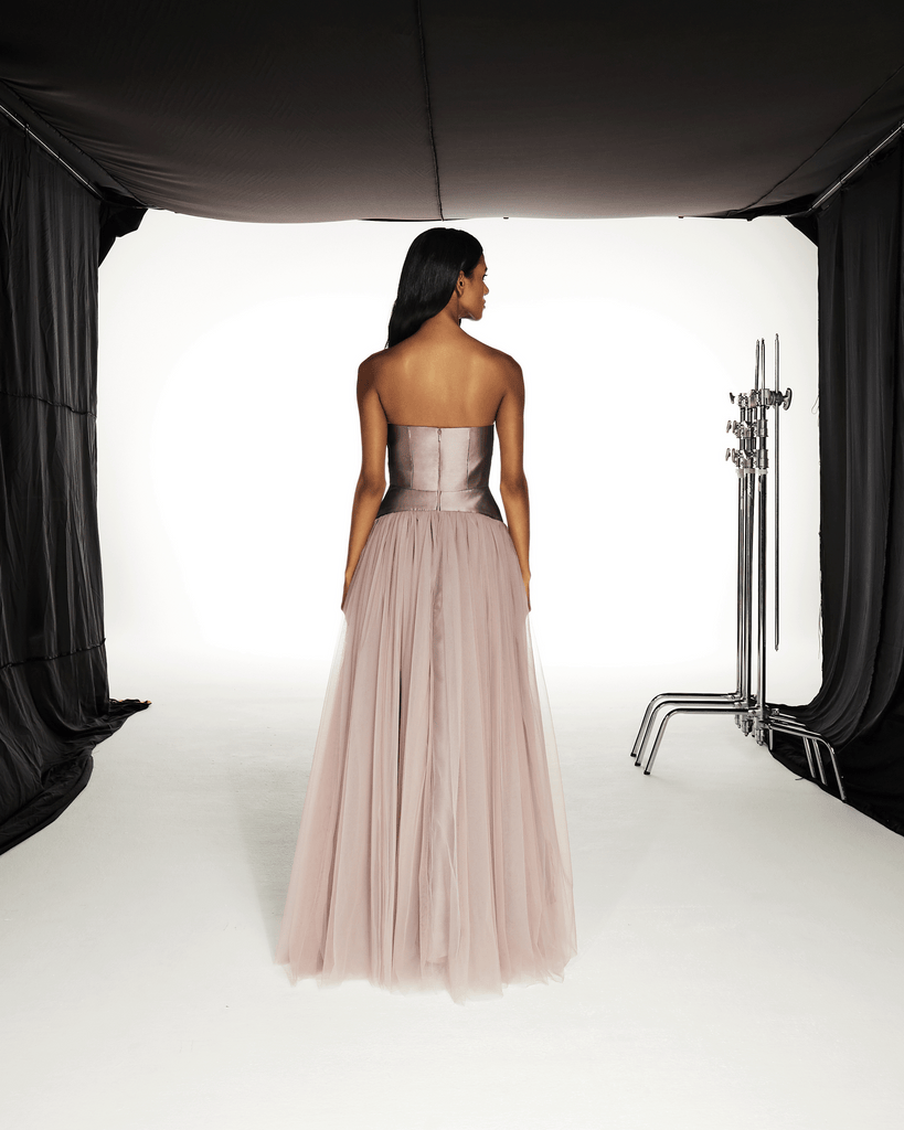 SHINY ORGANZA AND TULLE TUBE FLARED DRESS