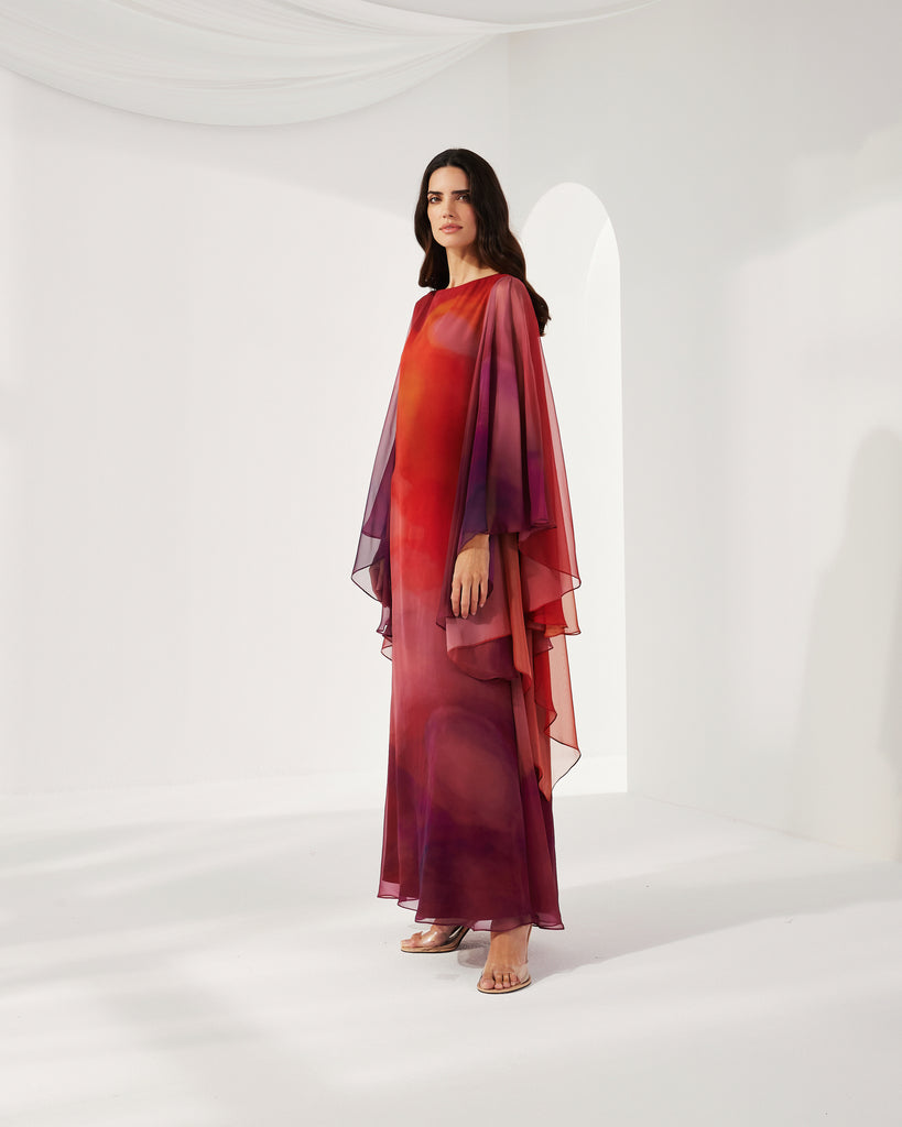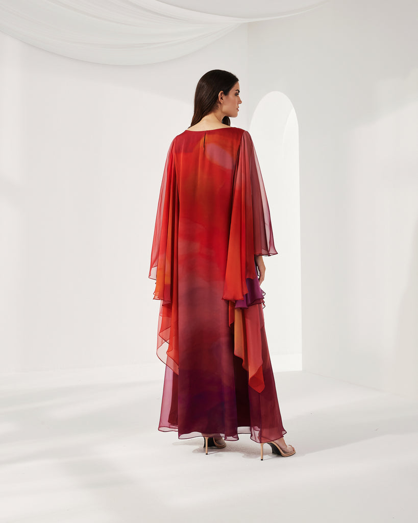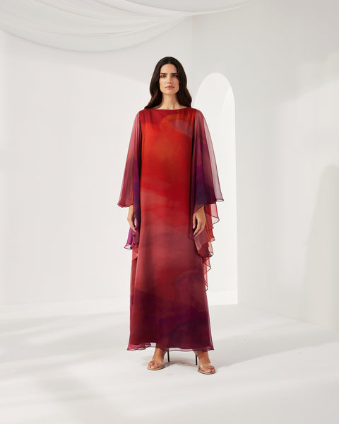 RED MULTICOLOR PRINTED CHIFFON OVERSIZED DRESS WITH LONG SLEEVES