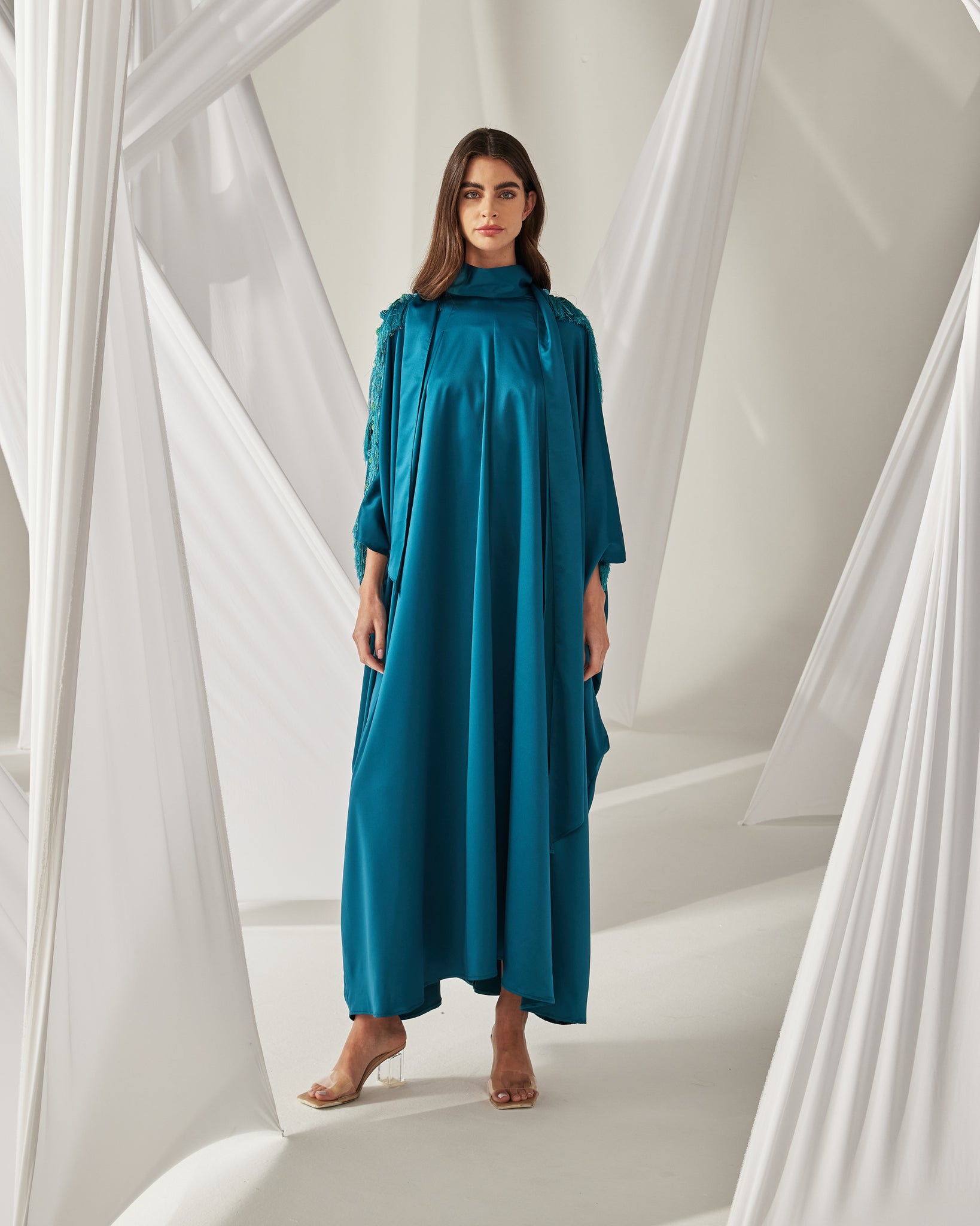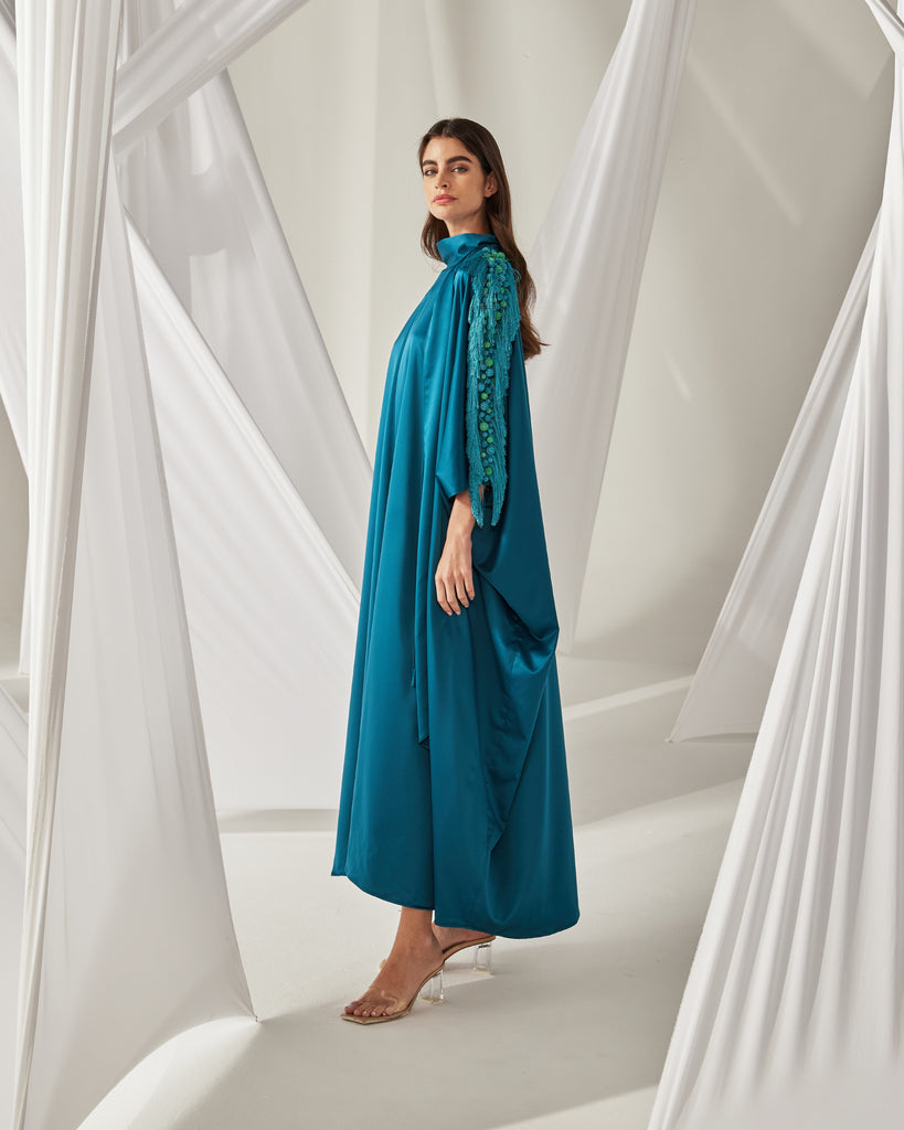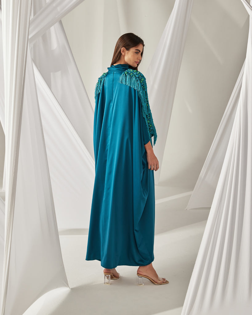 TEAL SATIN TASSEL EMBROIDERY OVERSIZED DRESS