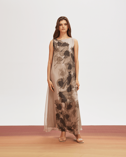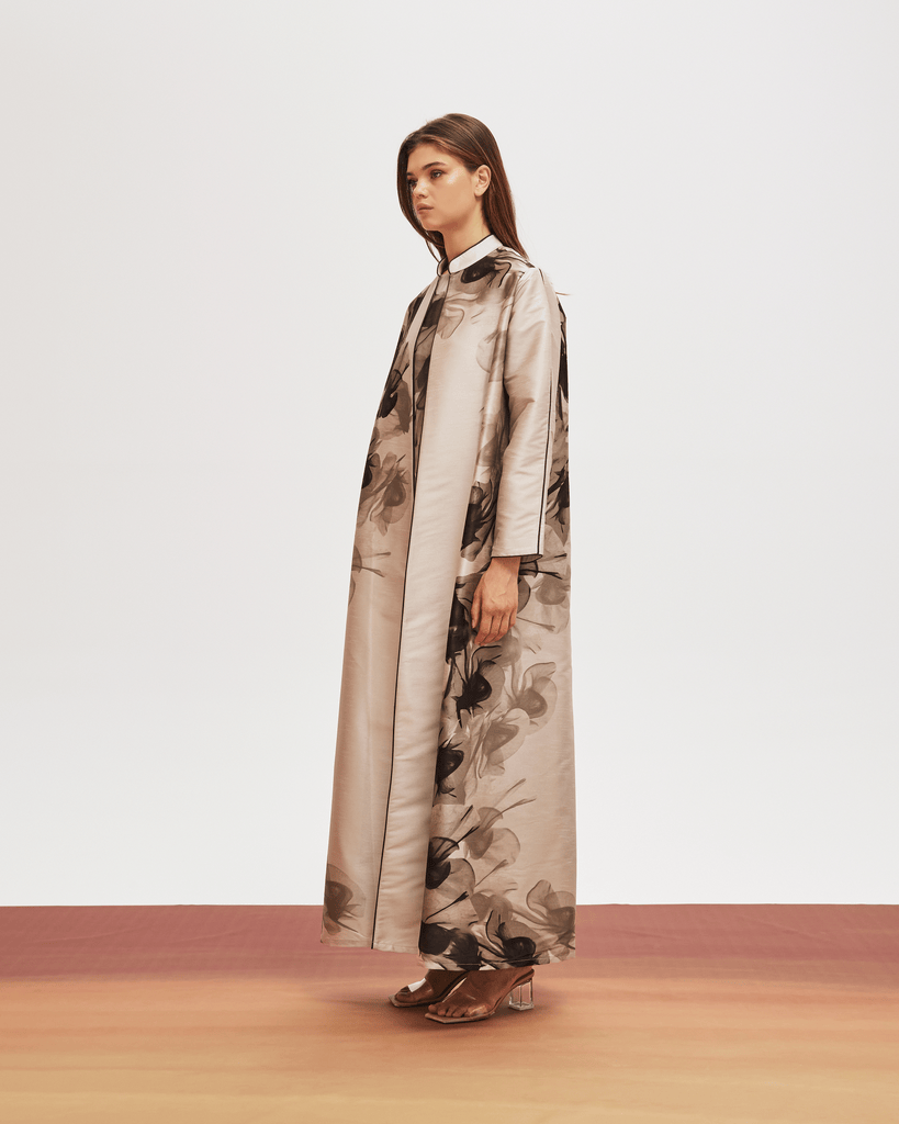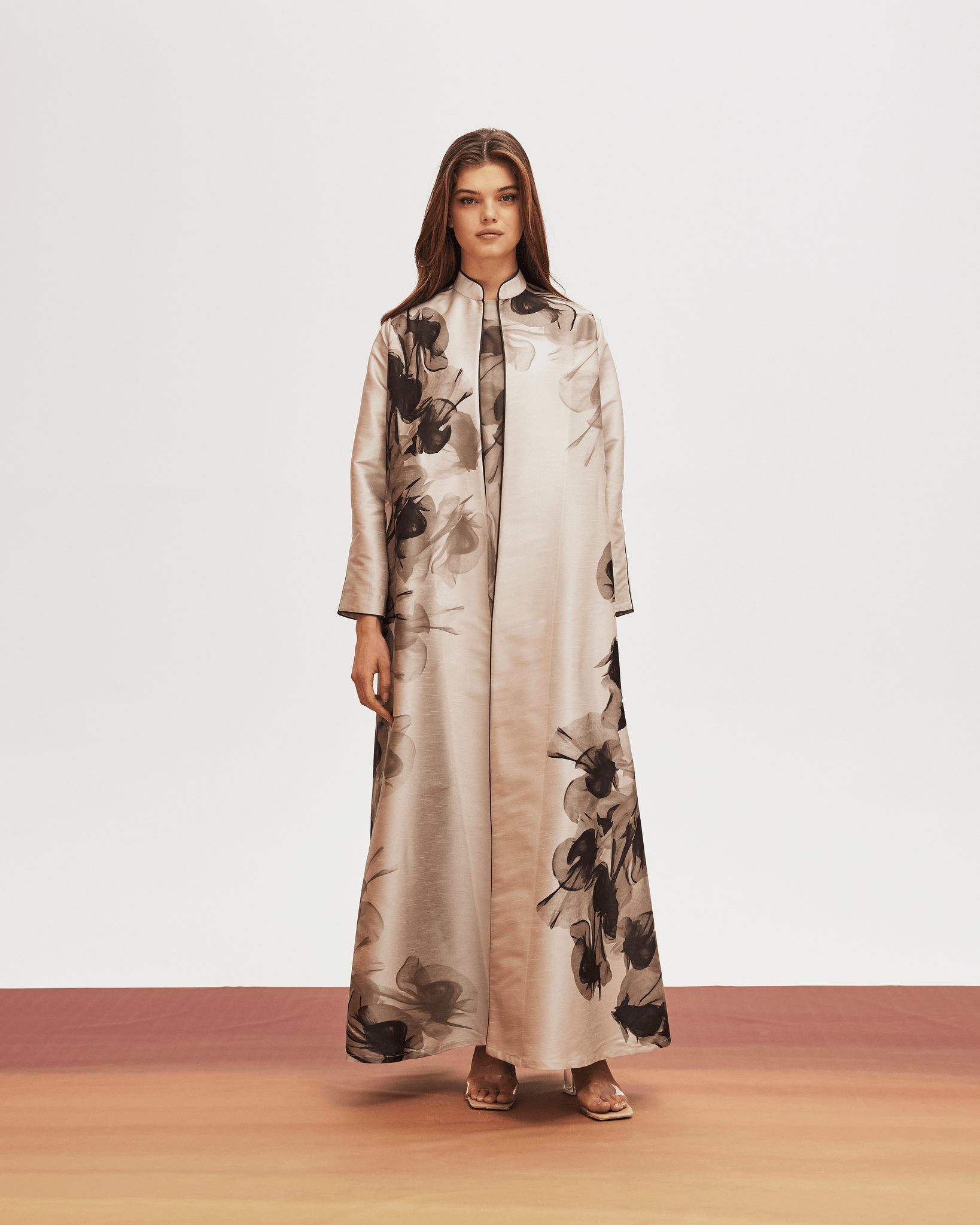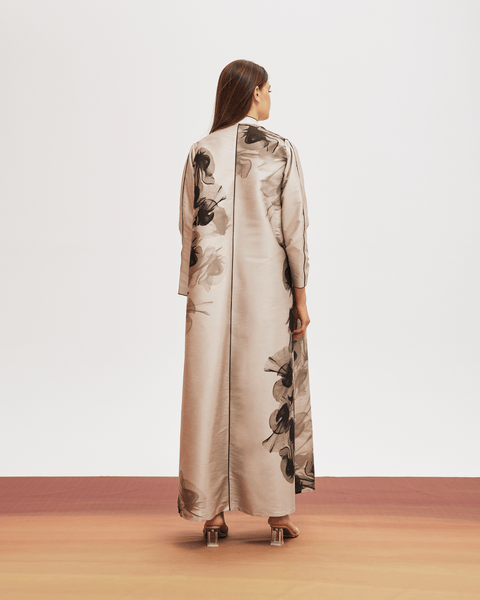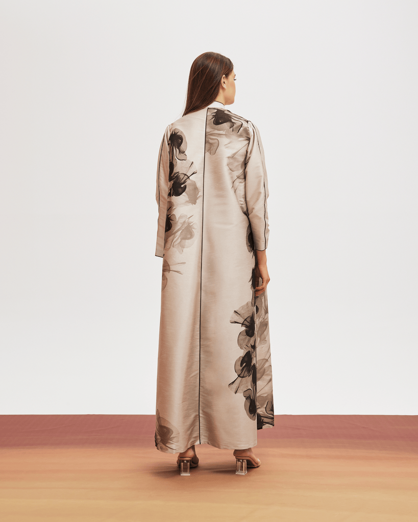 BEIGE PRINTED RAW SILK ABAYA WITH CHIFFON INNER DRESS