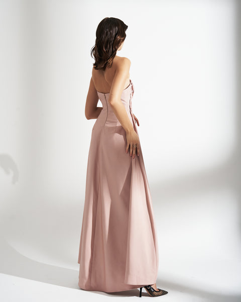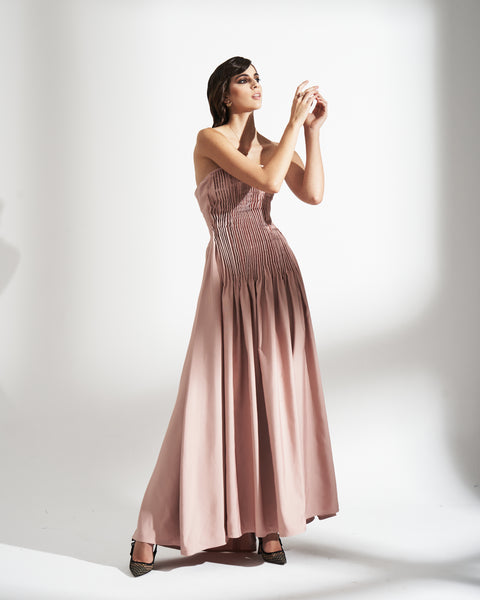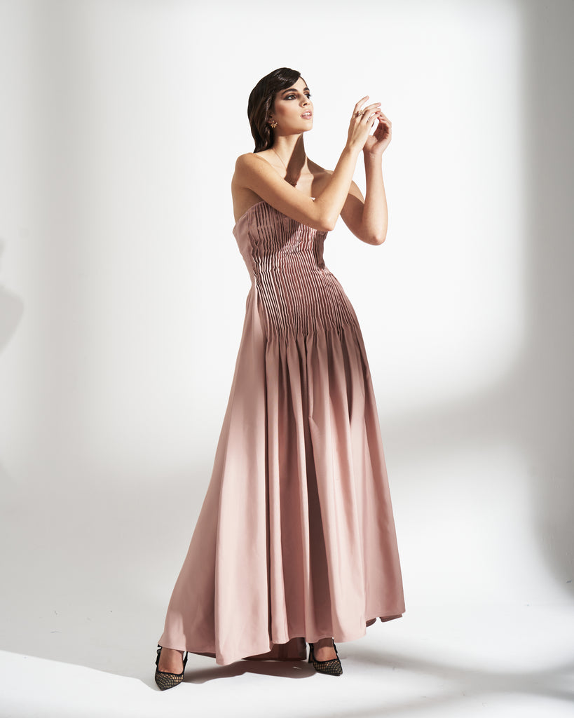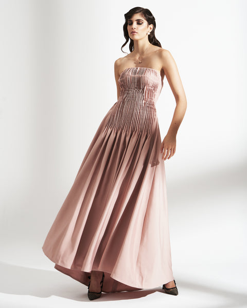 LINED BROCADE DRESS WITH PLEATED DETAILS