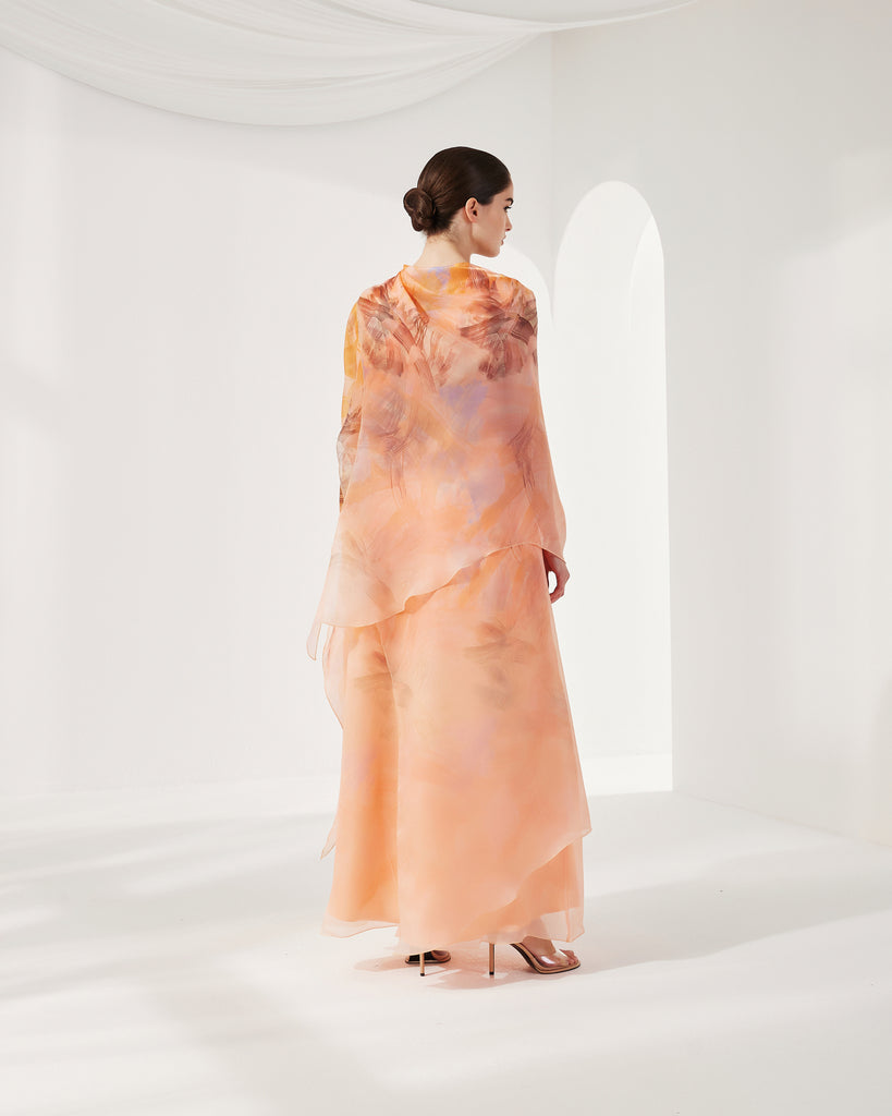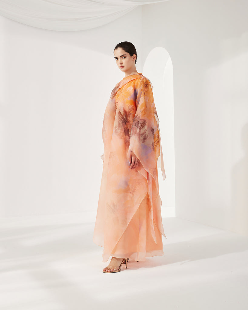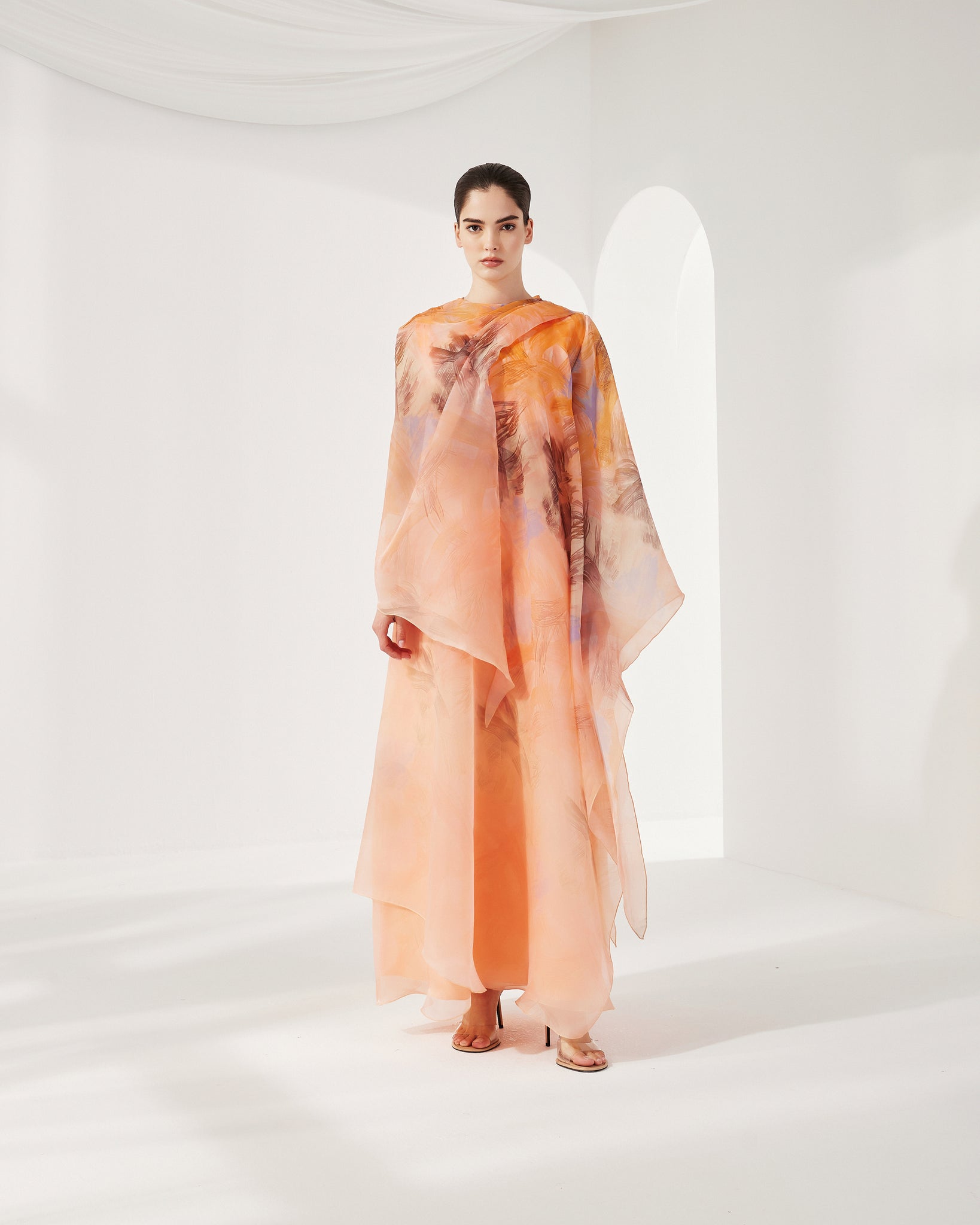 ORANGE PRINTED ORGANZA DRAPED OVERSIZED DRESS