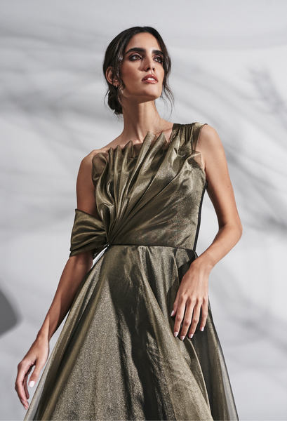 ORGANZA DRESS WITH PLEATED DETAILS AND SHORT SLEEVE