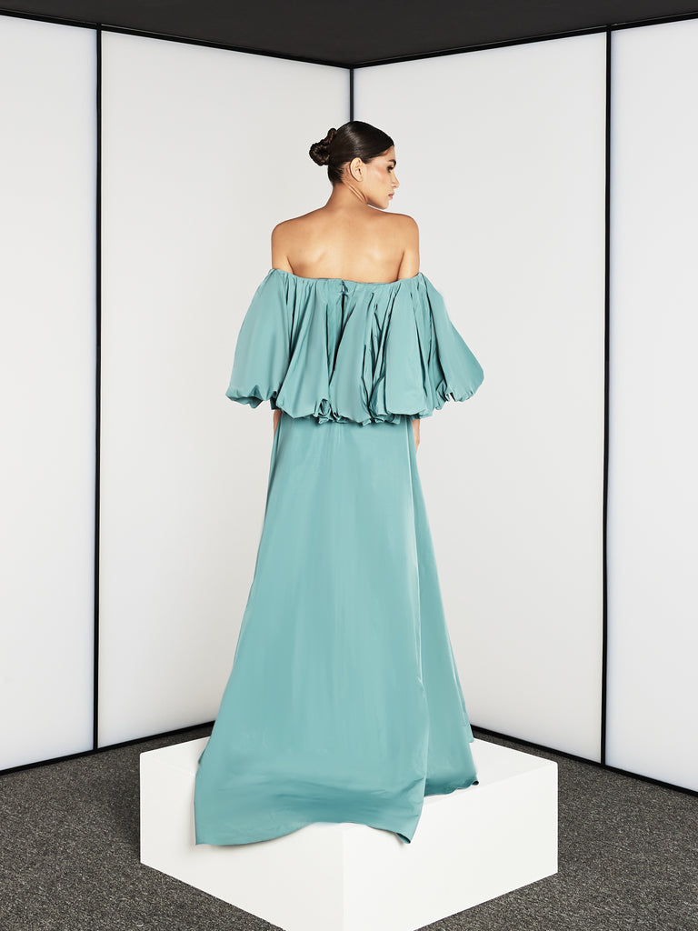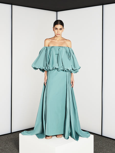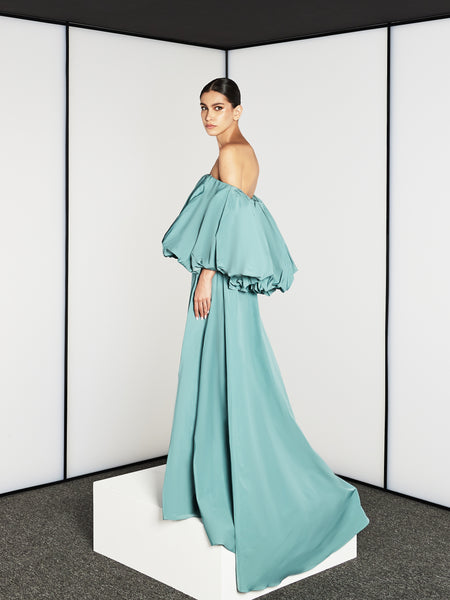 MATTE TAFFETA BALLON DRAMATIC SLEEVED DRESS WITH SIDE TRAIL